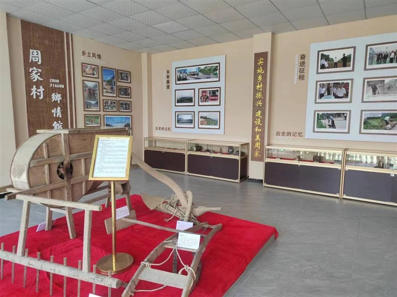 調研組還參觀了周家村“鄉情館”,里面陳列了鄉親們的舊物件,鄉情館由城投集團出資修建,2022年竣工投用,鄉情館的打造,留存了當地村民的農耕印記,讓孩子了解農耕文化,讓老人和歸鄉探親的人們留下念想,讓來訪的客人望得見山、看得見水、記得住鄉愁。里面陳列有舊式打谷機、煤油燈、犁、耙、蓑衣等具有年代氣息的農耕用具。每個人對這些老物件可能有不同的理解,歸根到底,它們代表了周家村的過去,應該被記住。
